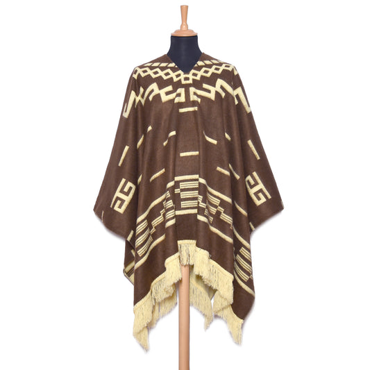 Black and Beige Alpaca Wool Poncho with Geometric Pattern